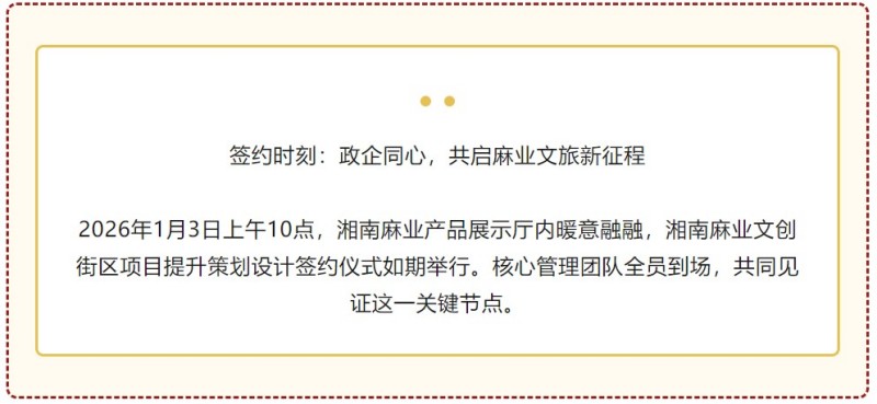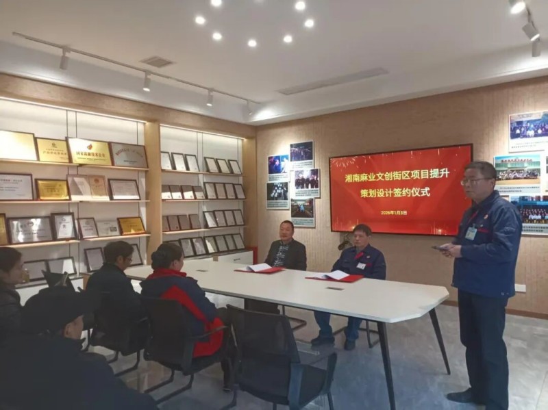 2026年1月3日上午10點,湘南麻業(yè)產(chǎn)品展示廳內(nèi)暖意融融,湘南麻業(yè)文創(chuàng)街區(qū)項目提升策劃設(shè)計簽約儀式如期舉行。核心管理團(tuán)隊全員到場,共同見證這一關(guān)鍵節(jié)點。